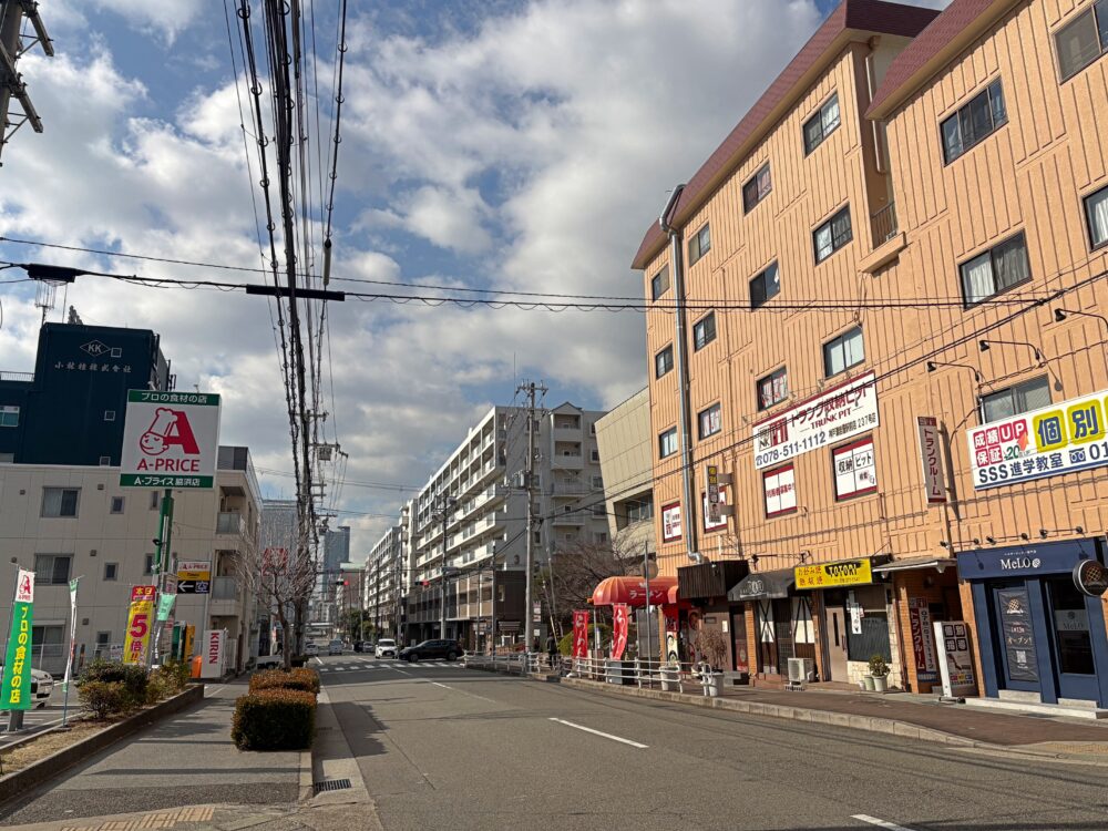 道路をはさんだ向かい側には業務用スーパーの「A-プライス」があるあたり。