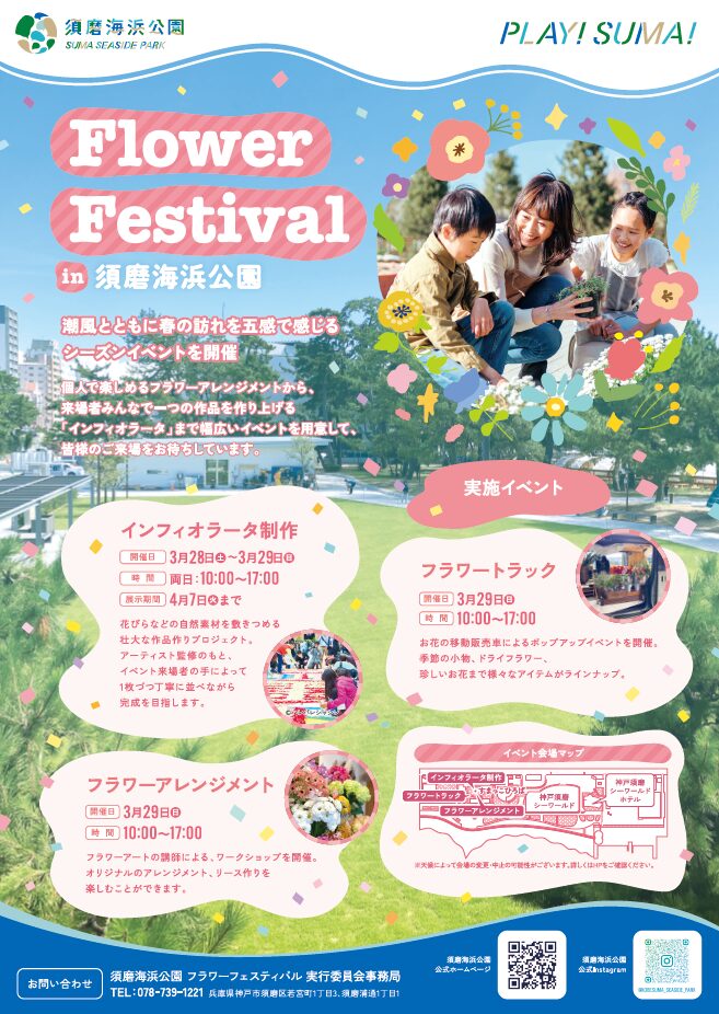須磨海浜公園で、大人から子どもまで楽しめる『屋外イベント』が開催されます。春のお花をテーマに、ワークショップ体験やお花の購入、無料の参加型コンテンツなども用意されています。