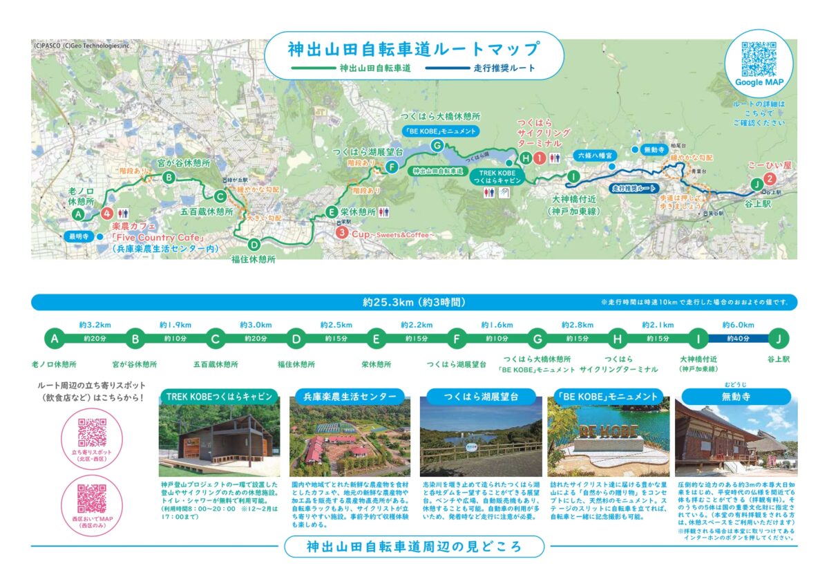 神戸の都心部からは車で約30分ほどのところにあり、コースの所要時間は往復で3時間程度になってます。
