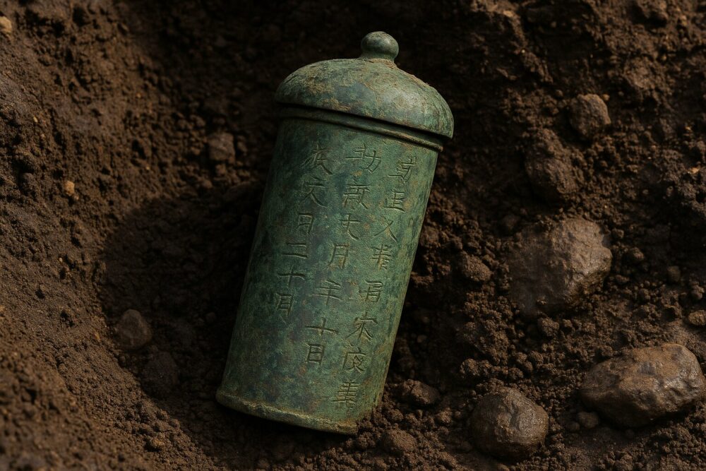 地中から出てきた平安時代の経筒のイメージ(AI作成)※実際は須恵器甕の外容器に入った状態で出土