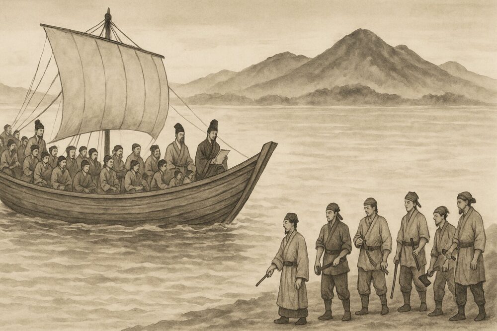 多様な分野の技術者を伴って明石に到着する百済の王子のイメージ(AI作成)