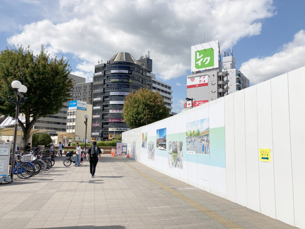 駅の中央改札側から見ると、工事用の仮囲いがずらっと並んでます。