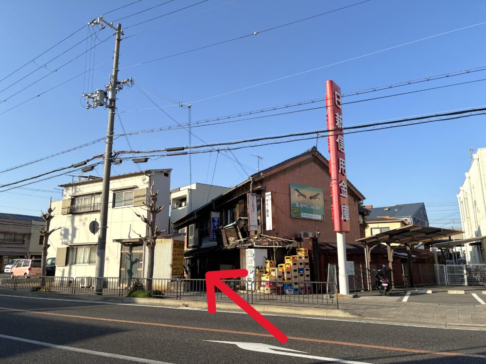 周辺の様子はこんな感じ。「日新信用金庫」の看板がお店の近くで、2号船沿いを西へ進むとアスピア明石などが見えてきます。