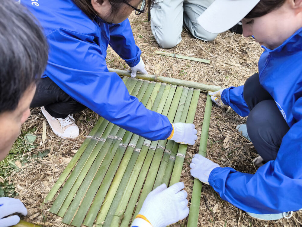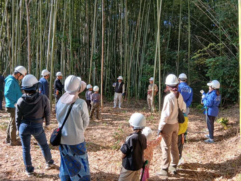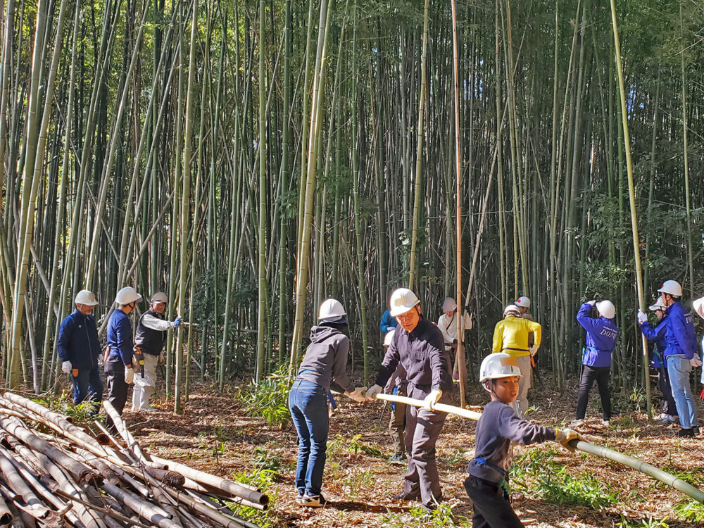 話を聞いたあと、実際に「竹林整備体験」を行います。11月の体験会では、竹の伐採だけでなく、枯れ竹を切ってまとめたり、伐採した竹の枝払いをしたりと、本格的な竹林整備を体験しました。