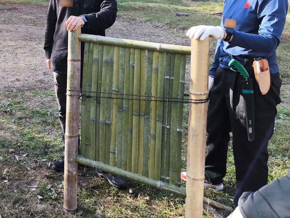 柱となる太い竹と組み合わせて、「看板」が完成! 今回制作した看板は、多井畑西区の活動場所で活用されるそうですよ。12月も引き続き看板制作を行い、ベンチなども作ってみる予定になっています。