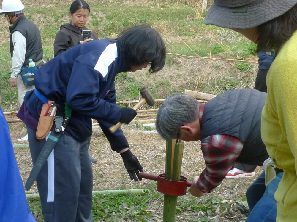 午後からは「ワークショップ」で、看板作りに挑戦。竹割り機・ナタ・ドリル・ノコギリなどいろいろな道具を使います。