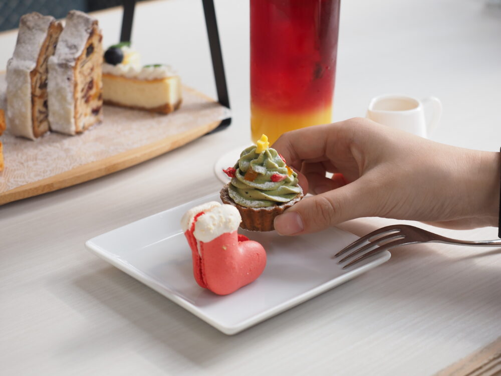 ツリー仕立ての抹茶と栗のタルトや、サンタブーツの形をした苺とバラのマカロン、伝統菓子シュトーレンをアレンジしたパウンドケーキなど、下段にもクリスマスらしさを楽しめるスイーツが。