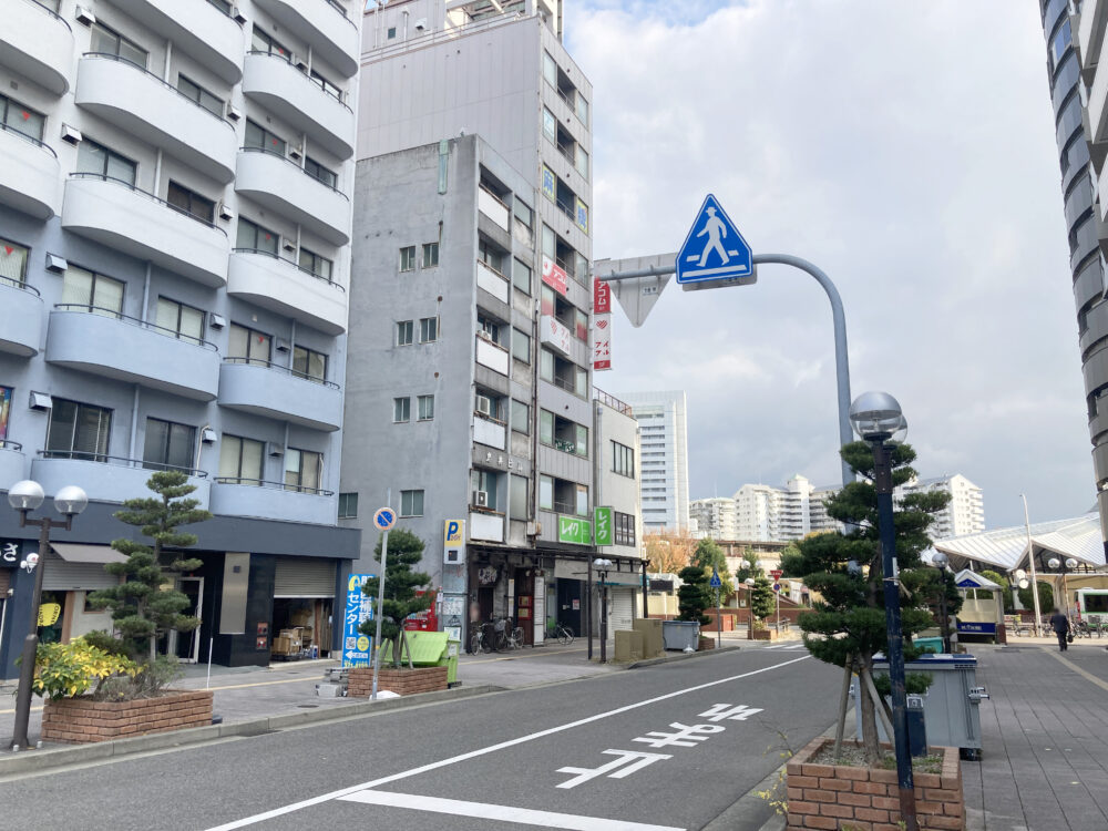 駅側を向くとホームやバスロータリーの屋根が見えてます。駅からの最短ルートは、再整備工事の関係で、横断歩道が渡れなくなってます。