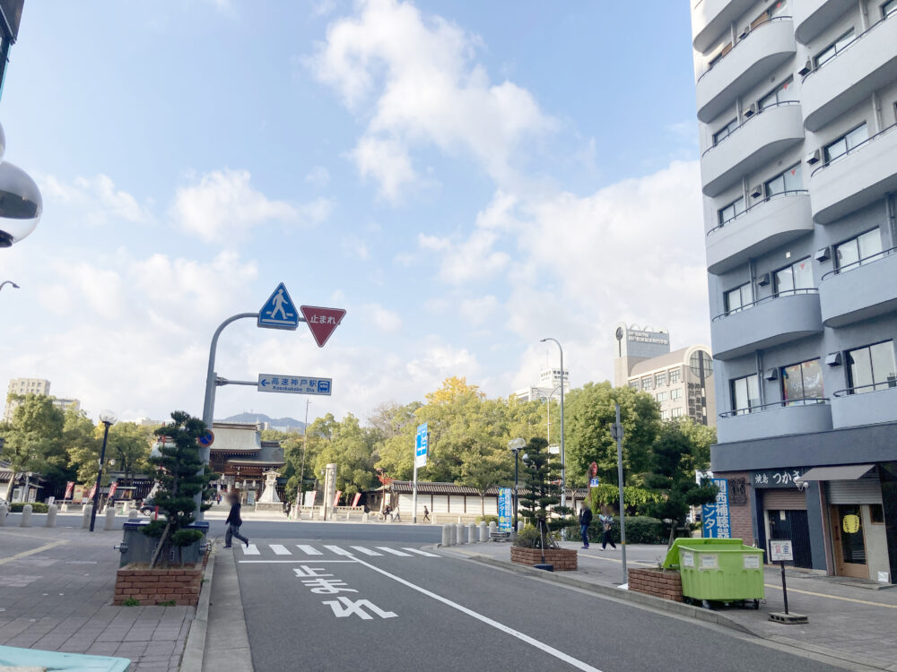 北を向くと、湊川神社が見えます。お隣は「焼鳥つかさ」で、向かい側は「菊水總本店」跡を改装した「EG神戸ビル」です。