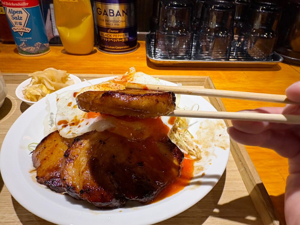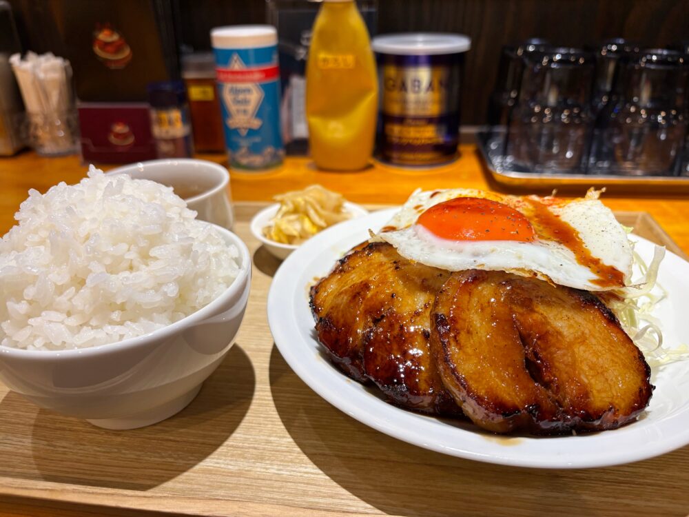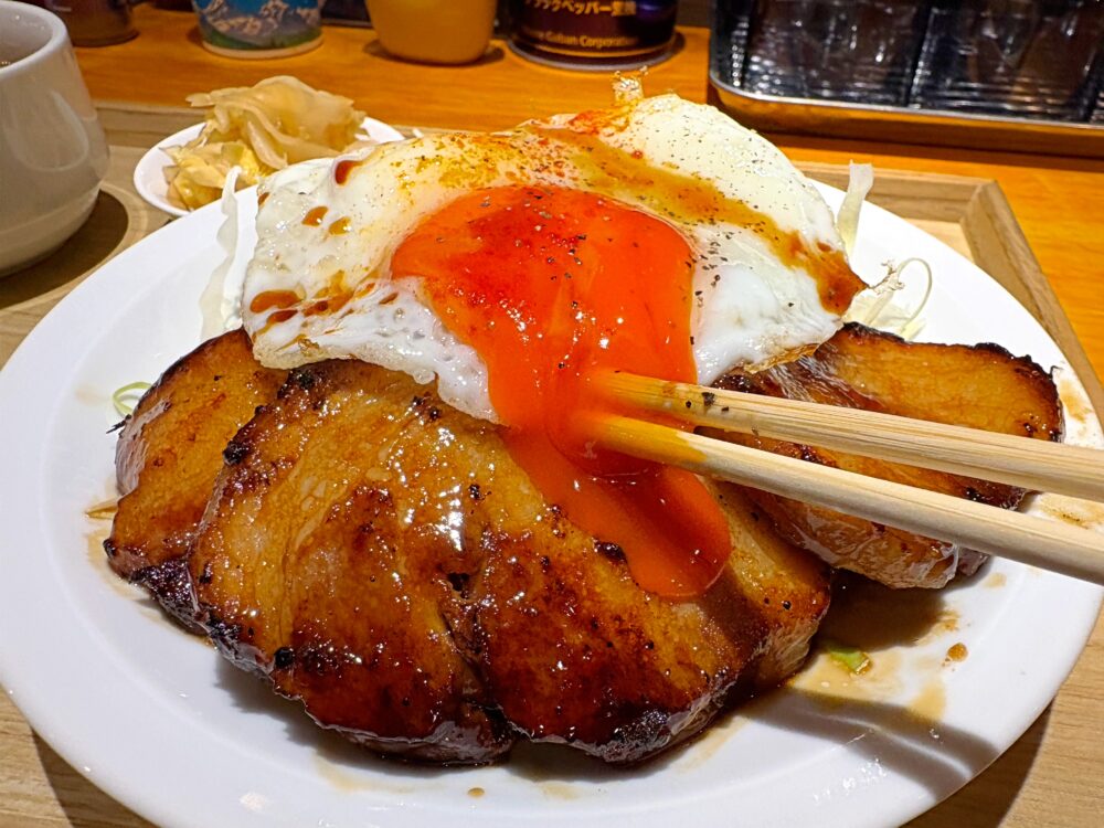今回は『チャンキー』でチャーシューエッグ定食を楽しみました。インパクトのある見た目ながら、とても食べやすい味付けのチャーシューは絶品。
