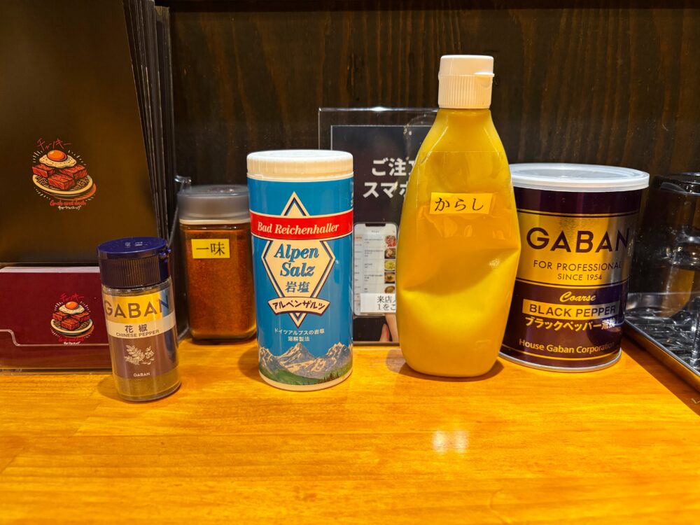 卓上には花椒・一味・岩塩・からし・ブラックペッパーなど、味変アイテムも豊富に用意されています。
