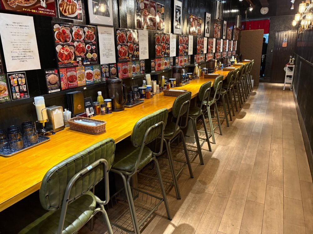 店内はカウンターのみの11席。メニューが各席の前に貼り出されていて、ひとりでも訪れやすい雰囲気です。椅子の下には荷物入れもありますよ。