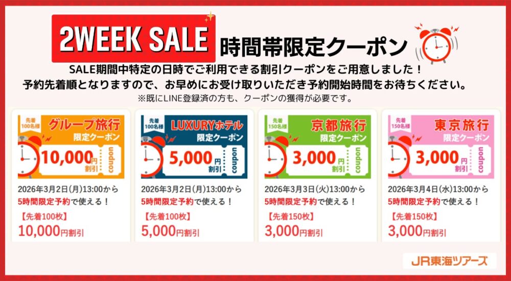 JR東海ツアーズLINE公式アカウントの友だち限定で、SALE期間中特定の日時で利用できる割引クーポンも登場。最大1万円割引のクーポンもありますよ。