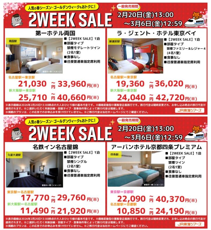 JR東海ツアーズが、新幹線とホテルがセットになったプランのセールを実施しています。販売期間は2026年2月20日(金)13:00から3月6日(金)12:59までです。