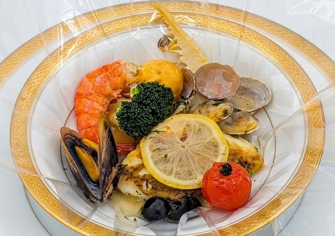 魚介のアクアパッツァ フィルム包み(鯛・ムール貝・あさりなど)/神戸牛と淡路玉葱のトマトパスタ(シェアスタイル)/オニオングラタンスープ/バケット・ロールパン