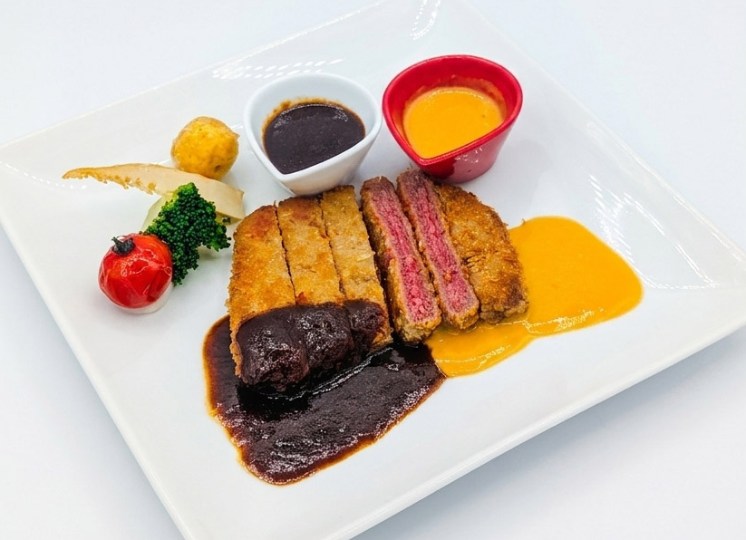 国産牛ロースのミラノ風カツレツ仕立/温野菜添え 2色ソース( デミグラス & チーズ )/神戸牛と淡路玉葱のトマトパスタ(シェアスタイル)/オニオングラタンスープ/バケット・ロールパン