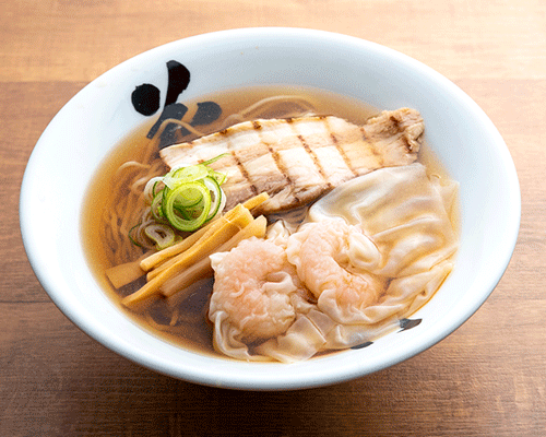 自家製の薄皮ワンタンに海老丸ごと1尾包んだ「ふわっとろっぷりっ」の食感と、魚介系あっさり醬油味スープが特徴です。