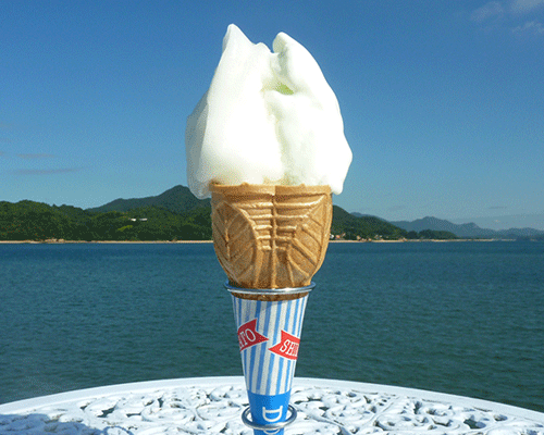 瀬戸田の柑橘やしまなみ海道の名産品を使ったジェラート。国産レモンの甘酸っぱさと甘い塩ミルクが絶妙にマッチします。