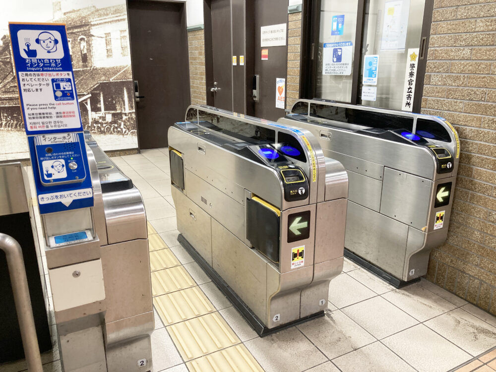 改札の機械が、入る用2つ・出る用1つの計3つある改札口です。