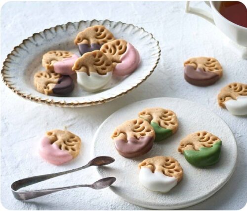 玄米のポン菓子を使ったサブレは、愛媛・新宮町の抹茶や香川の天日塩など、瀬戸内の素材を生かしたチョコをかけて。ほかにチョコやいちごなど3種のチョコがけサブレも。