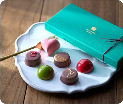 玄米茶×黒糖くるみ、抹茶×ライチなど、独創的なフレーバーは、お店の味を丸ごと知れるひと箱。赤い模様が描かれた和紅茶のショコラは、“金魚の町”である大和郡山にちなんで赤い金魚をイメージしたもの。ショコラの美しい模様はすべて、西田さんが吹付けや直接描いて仕上げています。