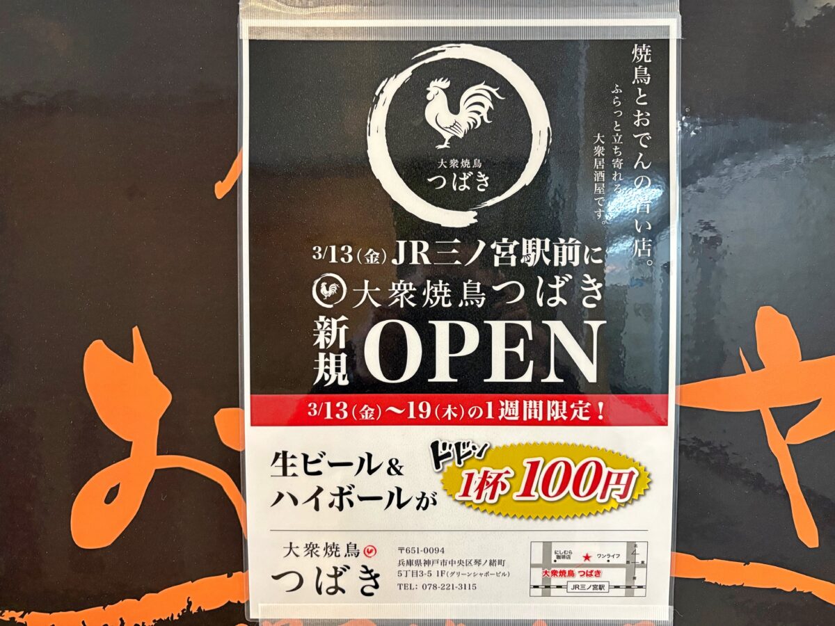 JR 三ノ宮駅のすぐ北側に『大衆焼鳥つばき』ってお店ができるみたいです。