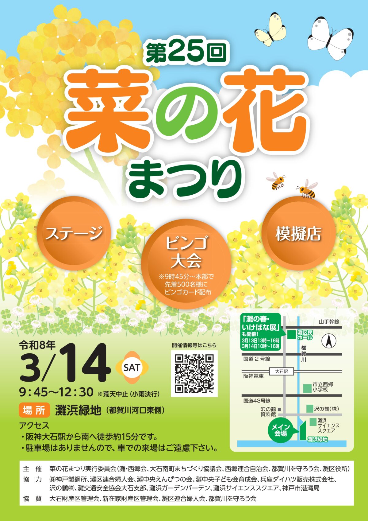 阪神 大石駅の海側にある「灘浜緑地」で、会場に咲く「菜の花」を見ながら、地域の人々による手づくりの祭りを楽しむことができるイベントが開催されます。
