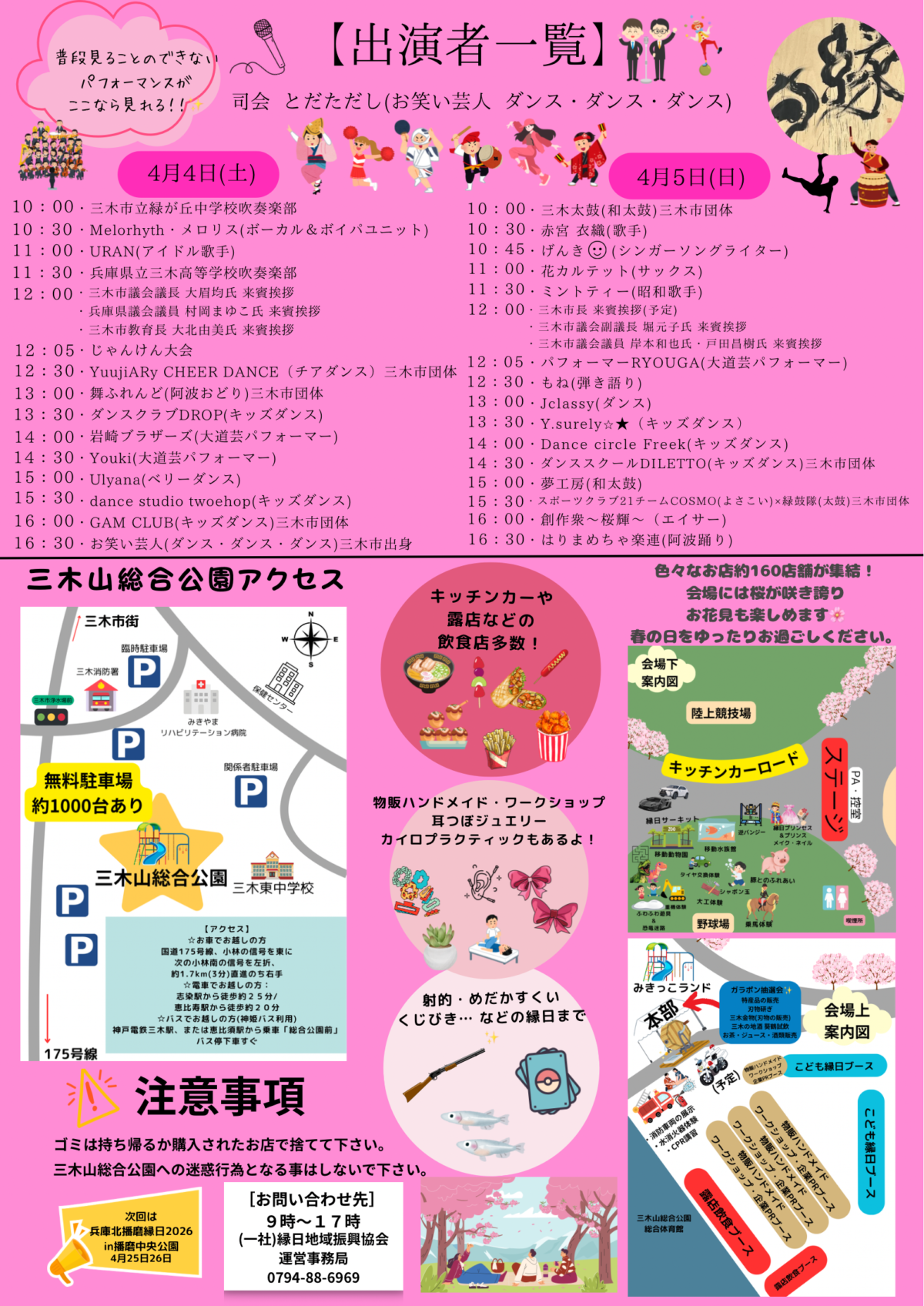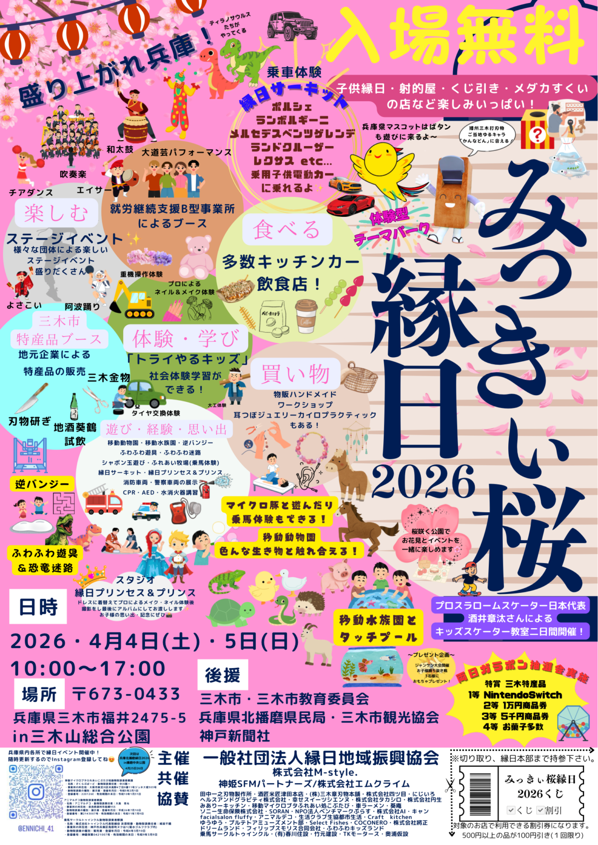 よさこい・吹奏楽・チアダンス・和太鼓・大道芸などの「ステージイベント」も開催されます。三木市の特産品・ニンテンドースイッチ・1万円商品券などが当たる「ガラポン抽選会」も実施予定です。