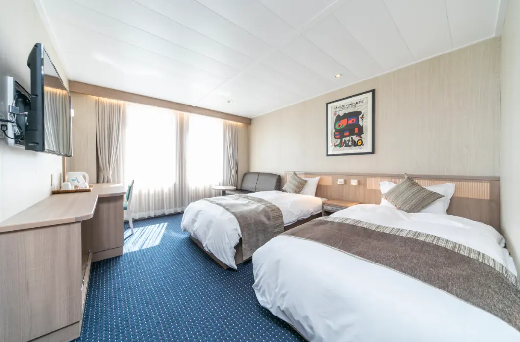 2~3名で利用できるデラックス和洋室があるみたい。完全個室でプライベート空間も確保でき、船内でゆったりくつろげそう。