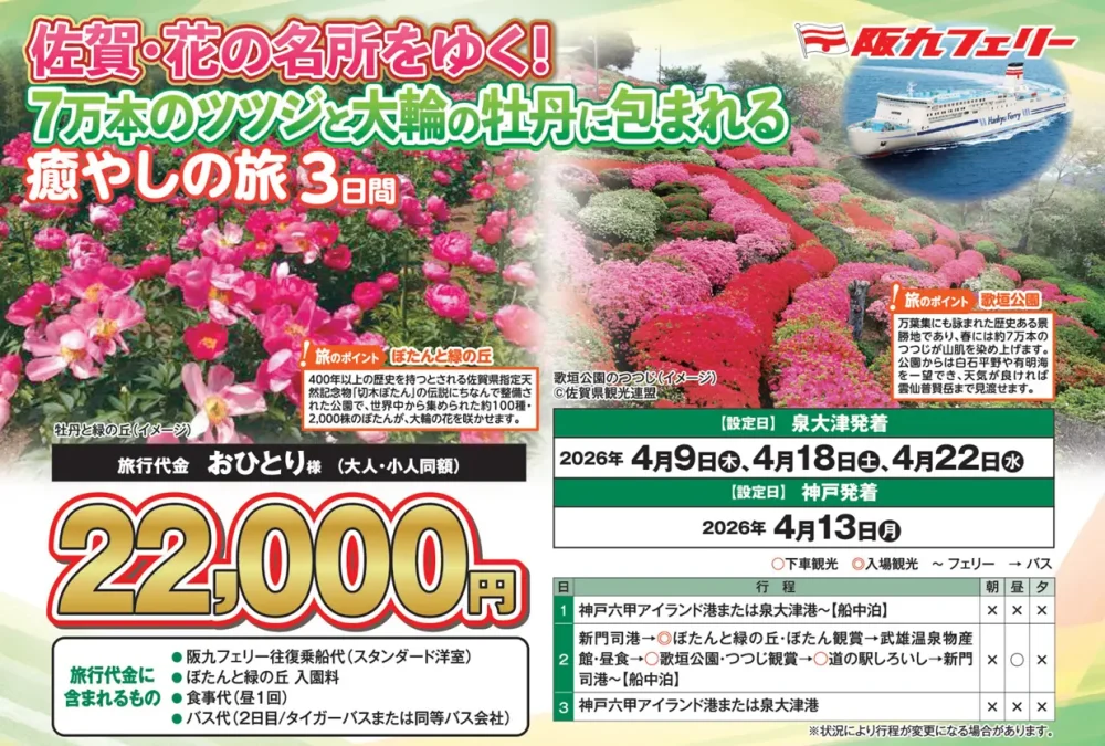 別府や湯布院などの温泉地で豪華な食事を楽しめる『阪九フェリーで行く九州・美食の旅セレクション』と牡丹やツツジ鑑賞を楽しめる団体ツアーが販売されてます。