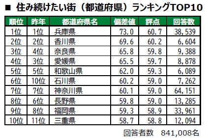 「住み続けたい街ランキング」では、兵庫県が堂々の1位にランクインしました。こちらも昨年から連続しての1位となります。