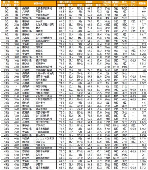 1位は兵庫県芦屋市で、昨年2位から1つ順位を上げました。2位は昨年13位から順位を上げた長野県上高井郡小布施町、3位は神奈川県三浦郡葉山町です。