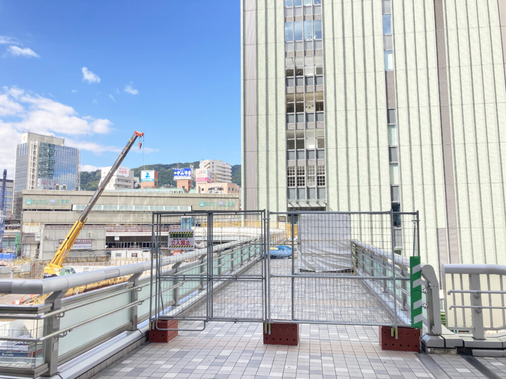 「通行止め」は2025年10月27日(水)からで、駅前から東西300mほどある「歩道者デッキ」を建設するのに合わせた「改築工事」のためです。