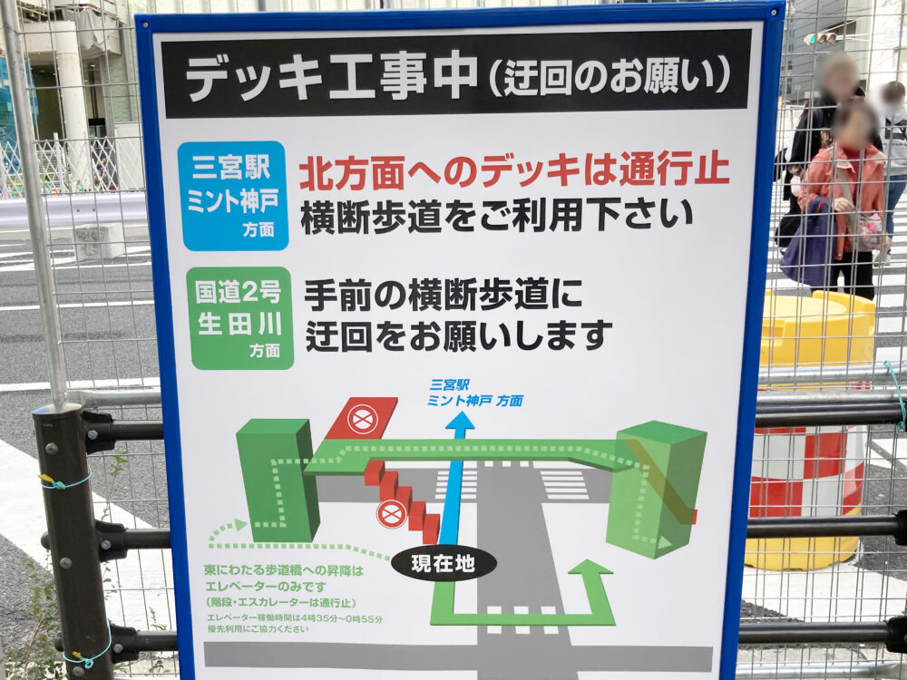JR三ノ宮駅から「ミント神戸」へ行く途中にあるエレベーター前では、警備員さんが看板を持ち、自動音声でデッキが通れないことをお知らせしています。