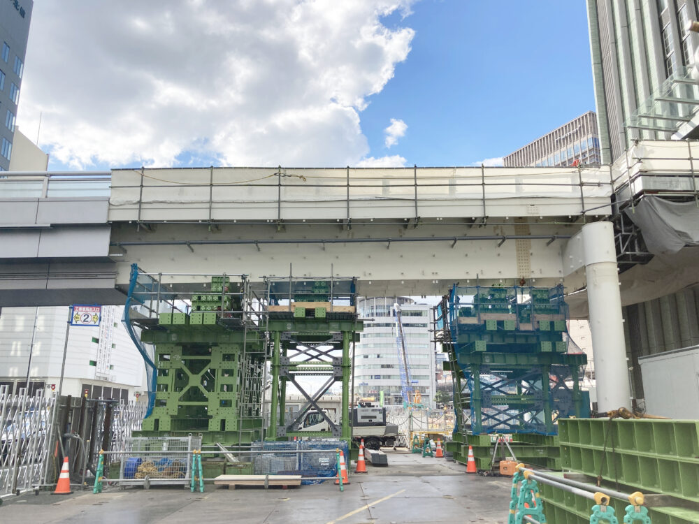 通れなくなったデッキは、一部化粧パネルなどが外され作業が始まっていました。このあたりから東側へ新たな歩行者デッキが接続していくものと思われます。