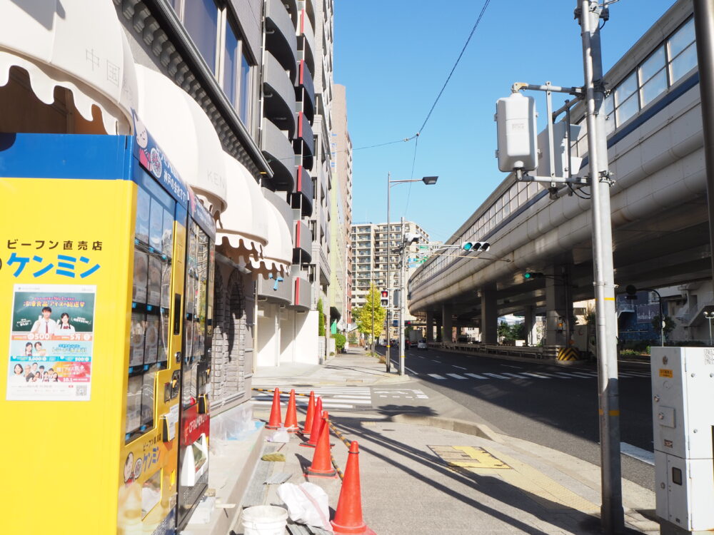 お店の場所は、国道2号線の「中突堤西」の信号の目の前、地下鉄海岸線「みなと元町駅」まで北へ歩いて2分ほどの場所です。