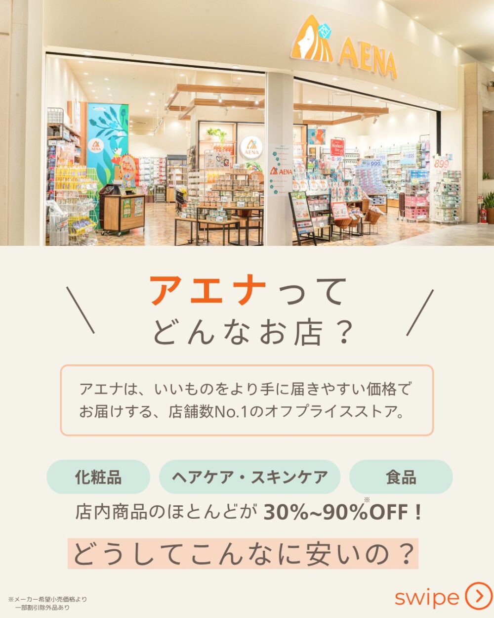 アエナは、化粧品・スキンケア・ヘアケア・食品・雑貨までそろう「オフプライスストア」です。店内商品は、30〜90%OFFのものばかりなのが特徴。