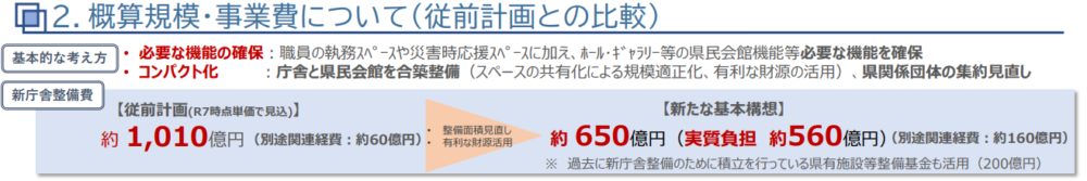 有識者などが参加する「県庁舎のあり方等に関する検討会」で示された資料によると、新たな計画での整備費は、約650億円。