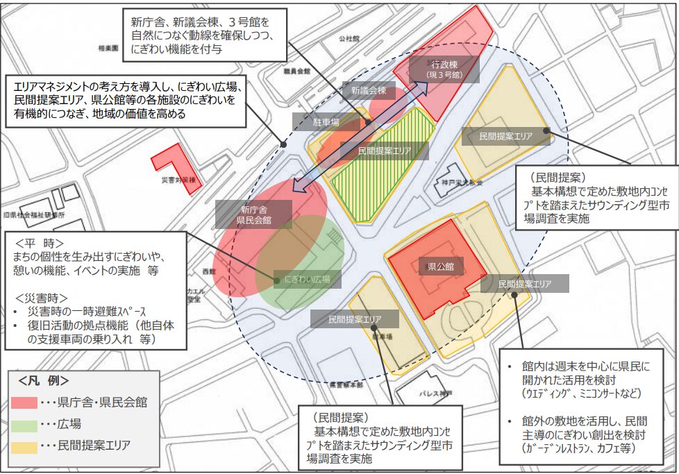 県の基本構想案では、耐震基準を満たさない「1、2号館」と「議場棟」「県民会館」などを解体し、1号館跡に「新庁舎」と「県民会館」を一体整備するとされてます。