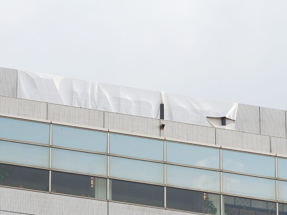 神戸駅の南口から見えていた外観の最上部についていたホテル名に、白い布がかけられています。