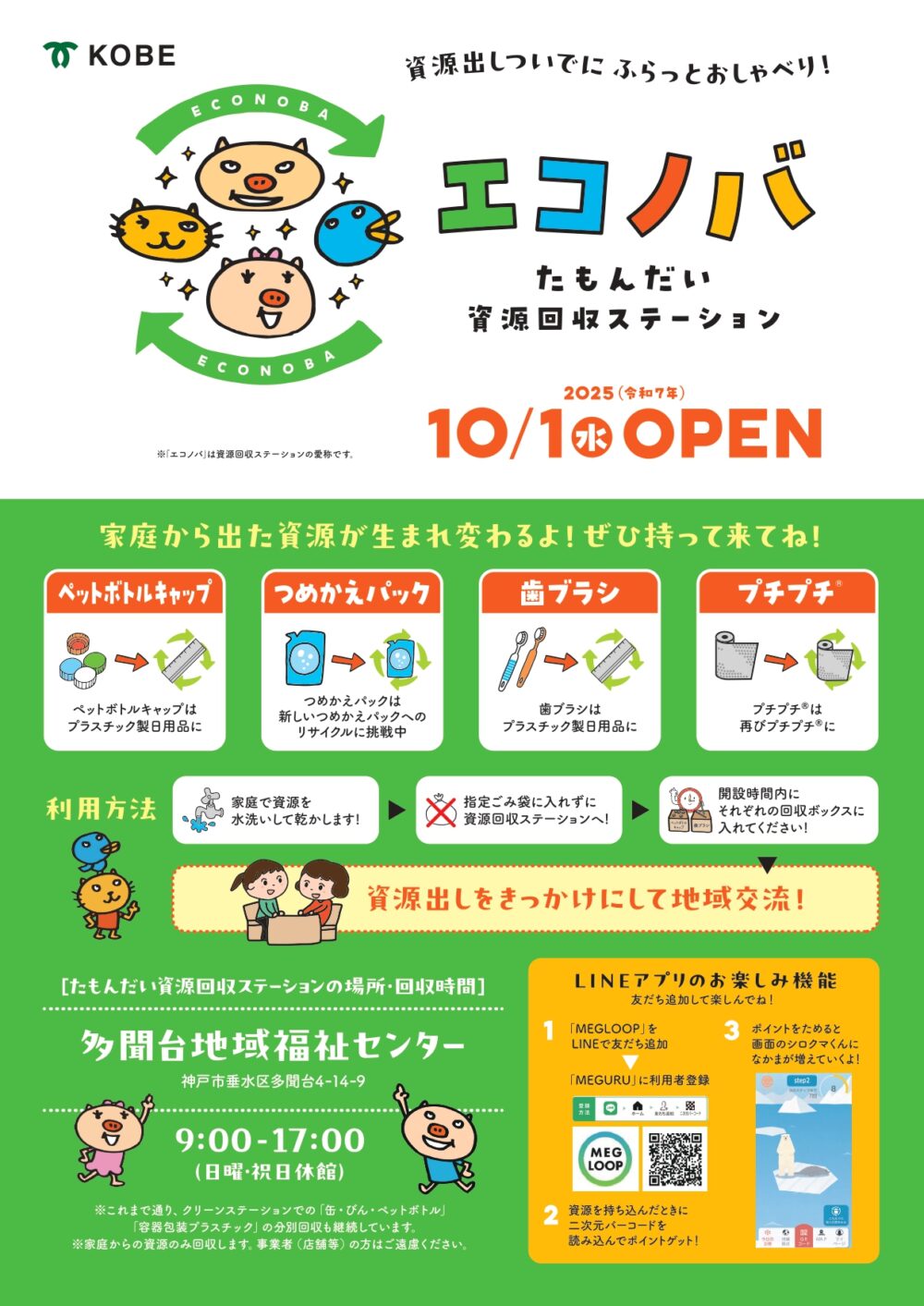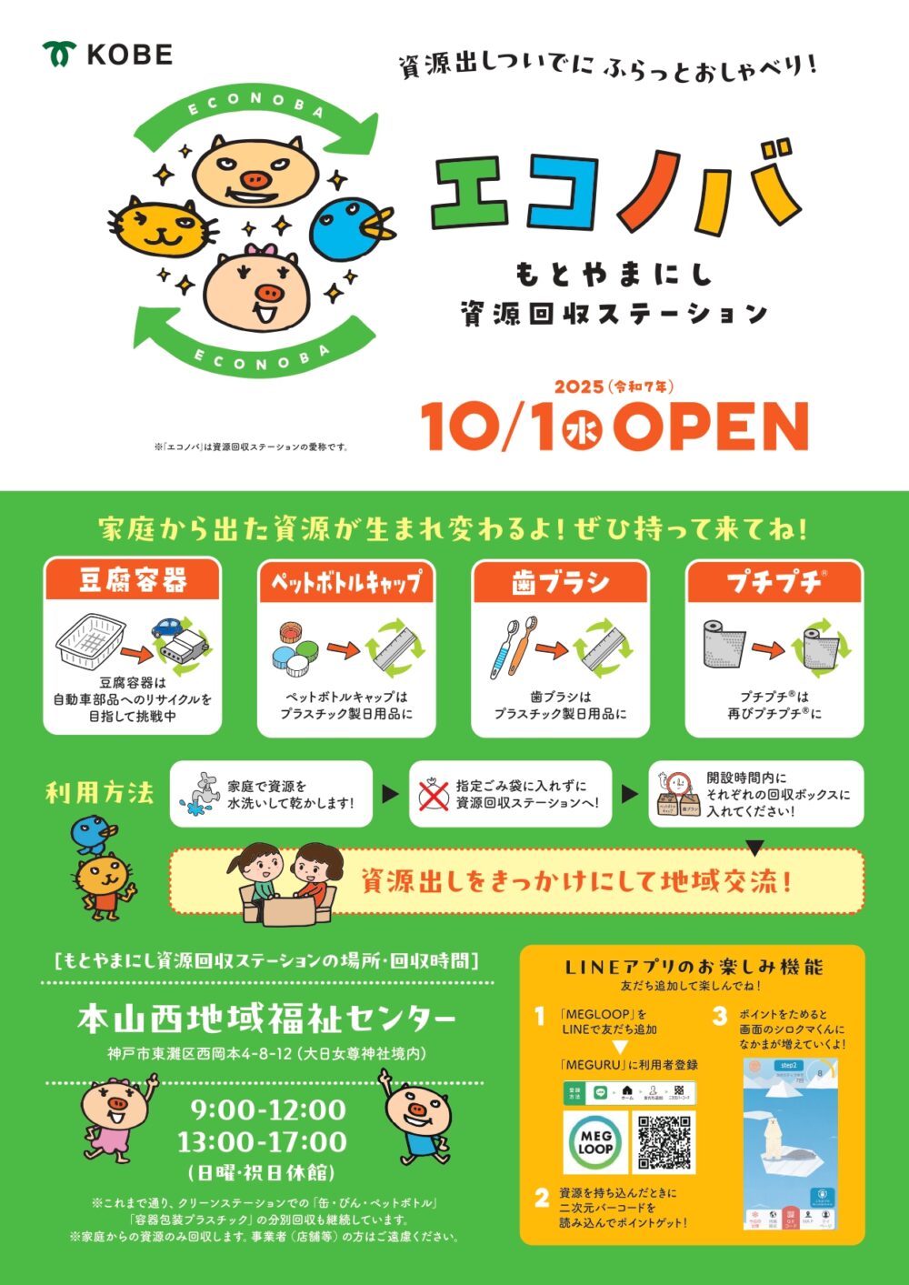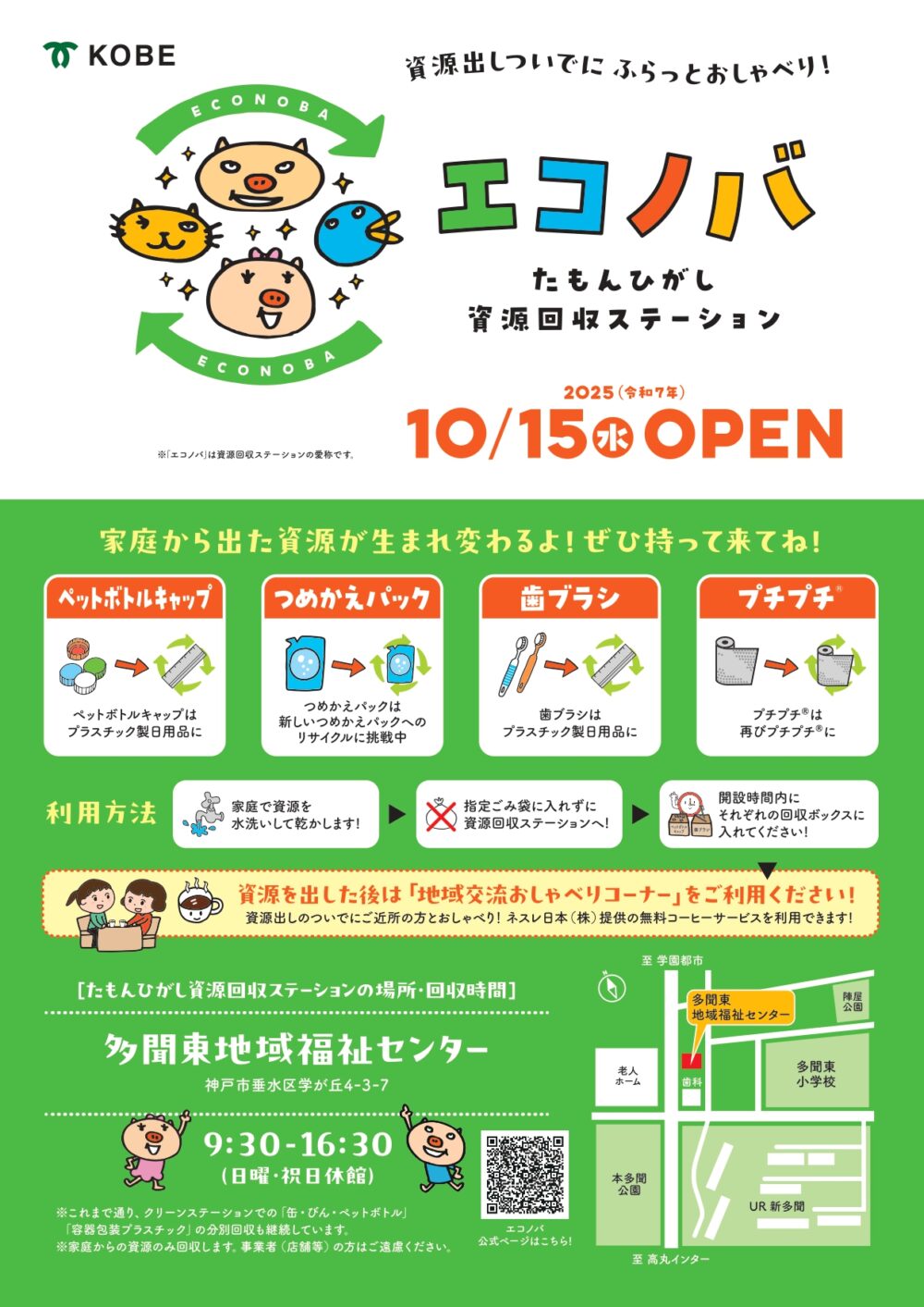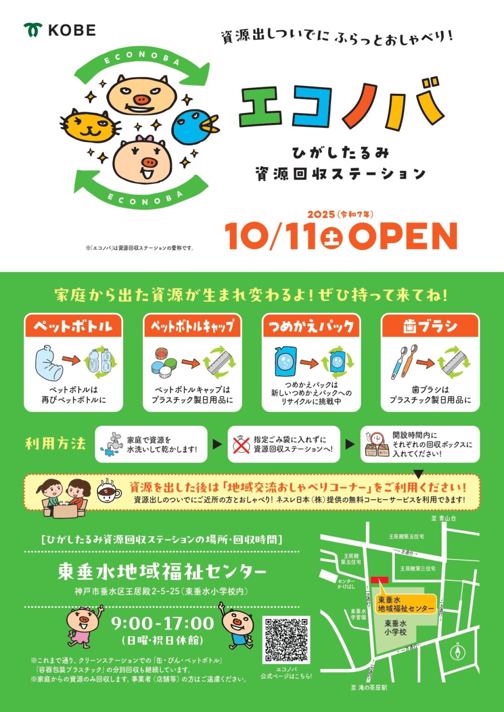 プラスチックのリサイクルと、地域交流の場づくりを目的とした『エコノバ』(資源回収ステーション)が新たに開設されたみたいです。東灘区に1か所・垂水区に3か所、合計4か所のエコノバが10月中に利用できるようになります。