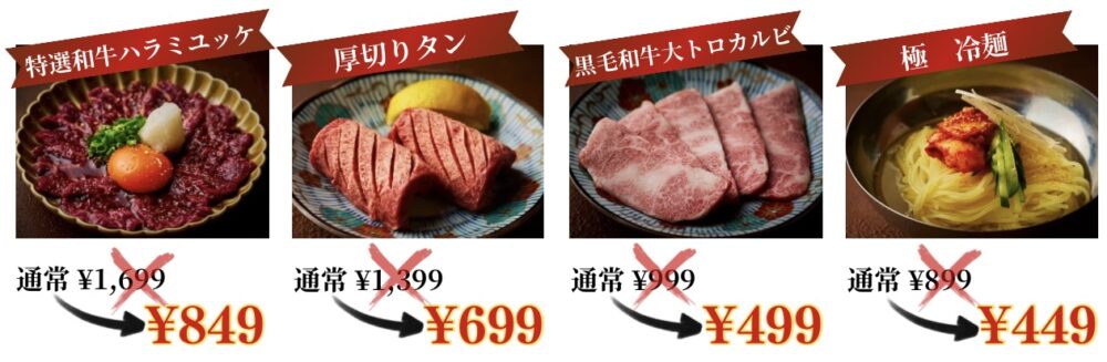 オープン記念として、12月30日までの期間、四大名物だという「厚切りタン」「冷麺」「大トロカルビ」「ハラミユッケ」を「半額」で提供するそう。