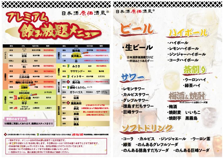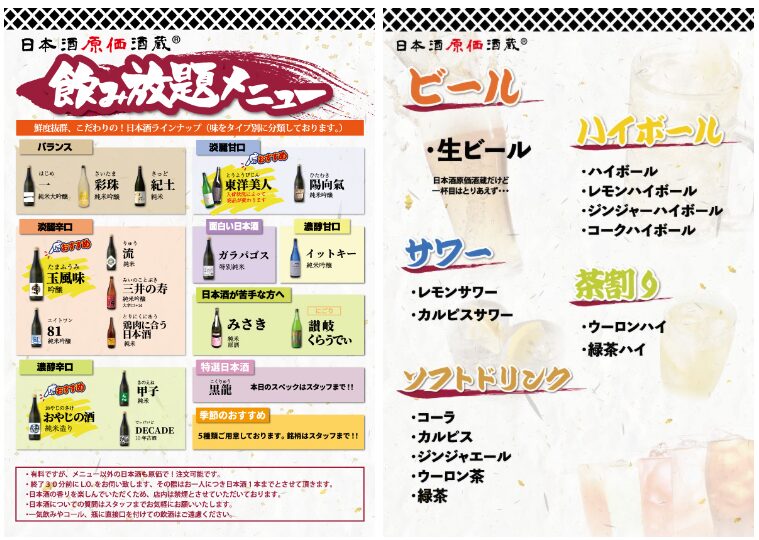 日本酒専門居酒屋『日本酒原価酒蔵』で、日本酒「20種」などが税込み1,490円~時間無制限の飲み放題で楽しめるキャンペーンが開催されます。4月限定です。