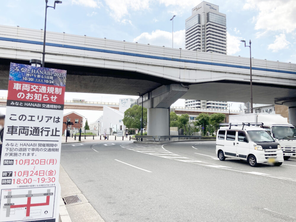 開催まで2週間ほどとなった10月上旬、メリケンパーク周辺には「車両交通規制」の予告の看板が設置されてます。