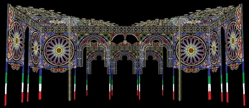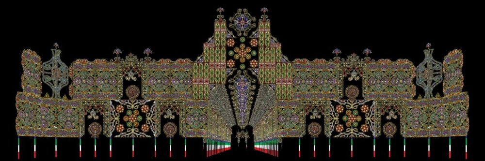芝生広場に全長約50m・最高部の高さ22mの光の壁掛け作品「スパッリエーラ」が設置されます。