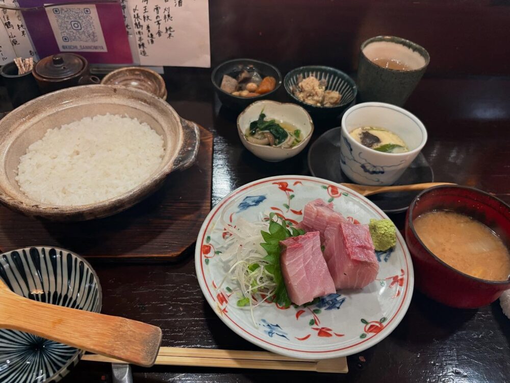 大きな土鍋で炊かれたご飯やみそ汁、3つの小鉢に茶碗蒸し付きでボリューム満点なのもうれしいポイント。