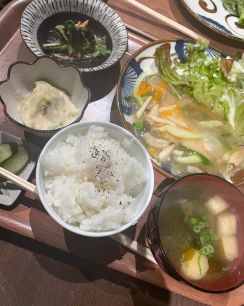 メイン料理もハンバーグや魚の煮付けなど日によって様々。汁物にも野菜がたっぷり入っています。
