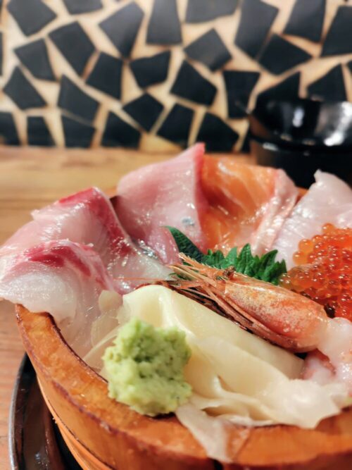 おすすめは、ランチ限定の海鮮丼です。本まぐろ・甘エビ・カンパチなど、桶からはみ出んばかりに盛り付けられたお刺身は圧巻の一言。その日に入荷された鮮魚の中から、おすすめの鮮魚が盛り付けられるそうです。