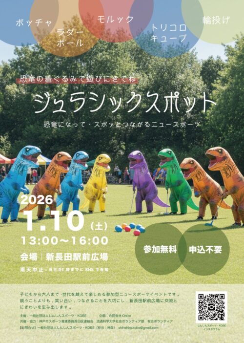 新長田駅前広場で、恐竜になりきってニュースポーツを体験することができるイベントが開催されます。