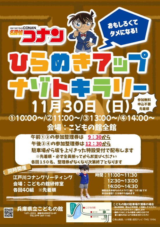 姫路市にある「県立こどもの館」で、無料のイベント『名探偵コナン ひらめきアップ ナゾトキラリー』が開催されます。